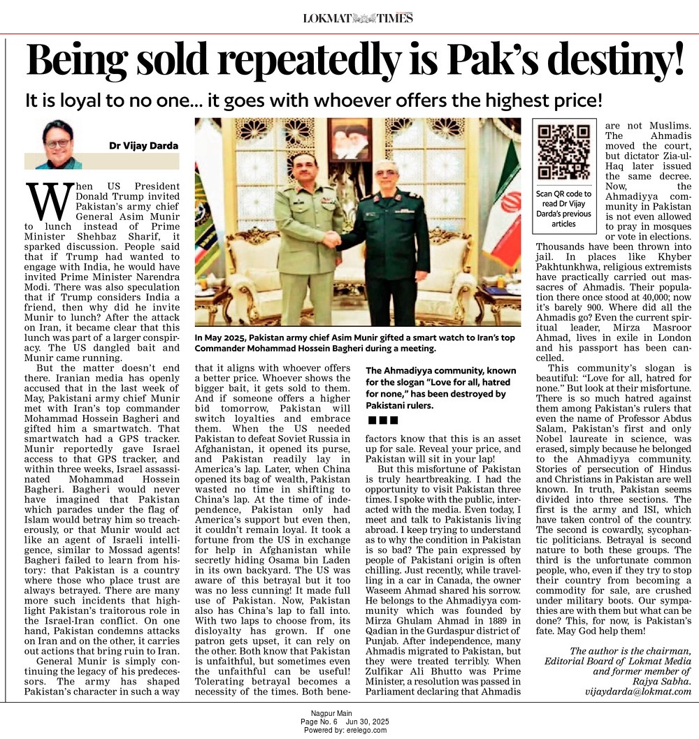 General Munir is simply continuing the legacy of his predecessors. The army has shaped Pakistan’s character in such a way that it aligns with whoever offers a better price. Whoever shows the bigger bait, it gets sold to them. And if someone offers a higher bid tomorrow, Pakistan will switch loyalties and embrace them. When the US needed Pakistan to defeat Soviet Russia in Afghanistan, it opened its purse, and Pakistan readily lay in America’s lap. Later, when China opened its bag of wealth, Pakistan wasted no time in shifting to China’s lap. At the time of independence, Pakistan only had America’s support but even then, it couldn’t remain loyal. It took a fortune from the US in exchange for help in Afghanistan while secretly hiding Osama bin Laden in its own backyard. The US was aware of this betrayal but it too was no less cunning! It made full use of Pakistan. Now, Pakistan also has China’s lap to fall into. With two laps to choose from, its disloyalty has grown. If one patron gets upset, it can rely on the other. Both know that Pakistan is unfaithful, but sometimes even the unfaithful can be useful! Tolerating betrayal becomes a necessity of the times. Both benefactors know that this is an asset up for sale. Reveal your price, and Pakistan will sit in your lap!