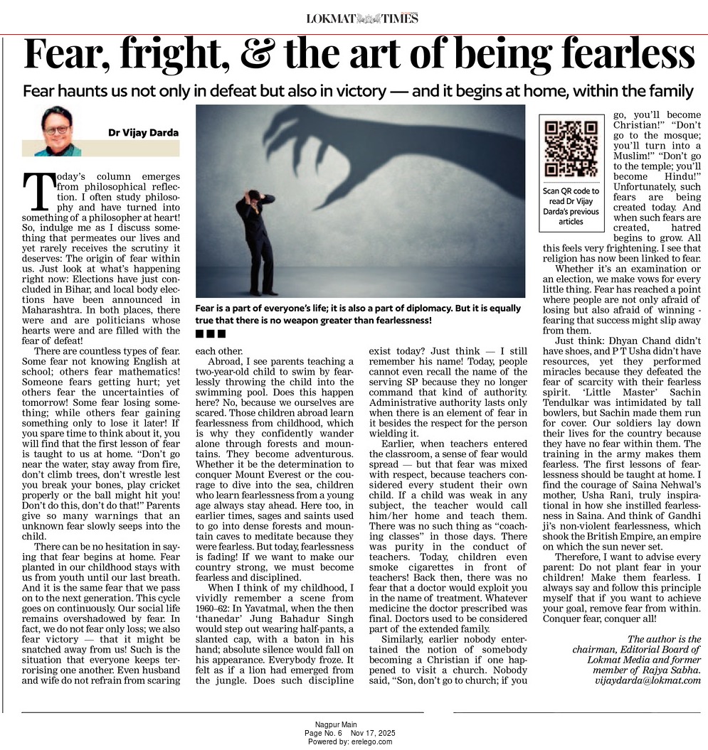 Today’s column emerges from philosophical reflection. I often study philosophy and have turned into something of a philosopher at heart! So, indulge me as I discuss something that permeates our lives and yet rarely receives the scrutiny it deserves: The origin of fear within us. Just look at what’s happening right now: Elections have just concluded in Bihar, and local body elections have been announced in Maharashtra. In both places, there were and are politicians whose hearts were and are filled with the fear of defeat!
