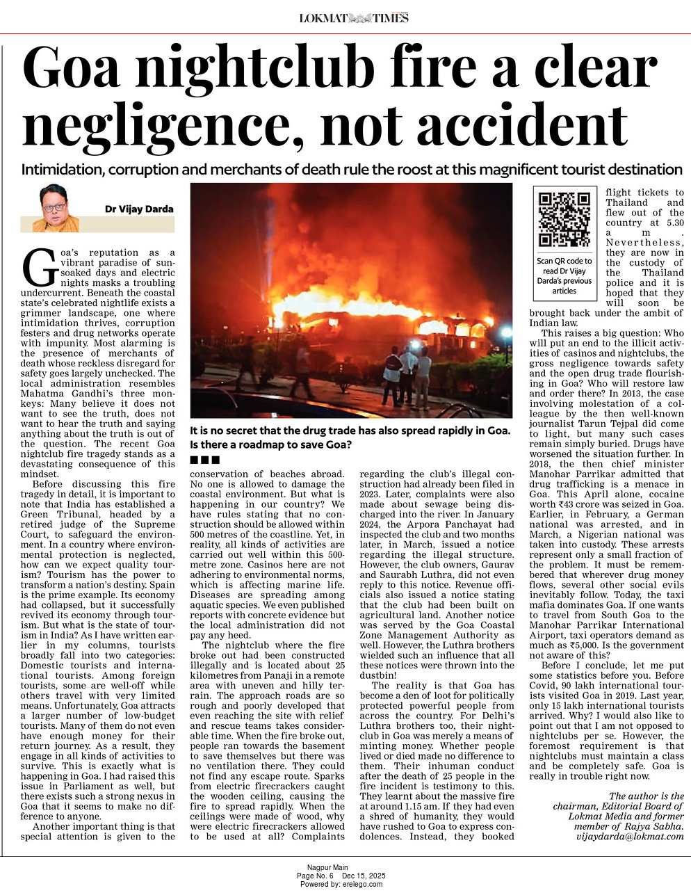 Goa’s reputation as a vibrant paradise of sun-soaked days and electric nights masks a troubling undercurrent. Beneath the coastal state’s celebrated nightlife exists a grimmer landscape, one where intimidation thrives, corruption festers and drug networks operate with impunity. Most alarming is the presence of merchants of death whose reckless disregard for safety goes largely unchecked. The local administration resembles Mahatma Gandhi’s three monkeys: Many believe it does not want to see the truth, does not want to hear the truth and saying anything about the truth is out of the question. The recent Goa nightclub fire tragedy stands as a devastating consequence of this mindset.