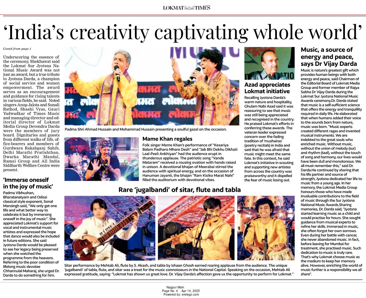 Recalling Jyotsna Darda’s warm nature and hospitality, Ghulam Nabi Azad said it was reassuring to see that music was still being appreciated and recognised in the country. He praised Lokmat’s efforts in conferring these awards. The veteran leader expressed concern over the fading tradition of ‘mushairas’ (poetry recitals) in India and said that he was afraid that music might meet the same fate. In this context, he said Lokmat’s initiative in scouting and supporting new artistes from across the country was praiseworthy and it dispelled the fear of music losing out. Azad, reflecting on his 45-year-long association with the Darda family, said Lokmat doesn’t just honour musicians but uplifts everyone—from MPs to village sarpanchs—by recognising their contributions and boosting morale.