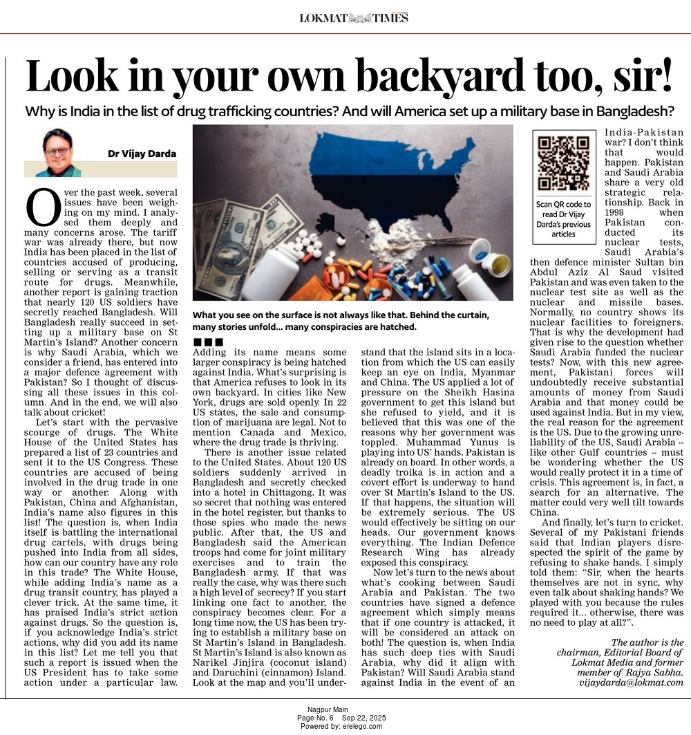 Over the past week, several issues have been weighing on my mind. I analysed them deeply and many concerns arose. The tariff war was already there, but now India has been placed in the list of countries accused of producing, selling or serving as a transit route for drugs. Meanwhile, another report is gaining traction that nearly 120 US soldiers have secretly reached Bangladesh. Will Bangladesh really succeed in setting up a military base on St Martin’s Island? Another concern is why Saudi Arabia, which we consider a friend, has entered into a major defence agreement with Pakistan? So I thought of discussing all these issues in this column. And in the end, we will also talk about cricket!