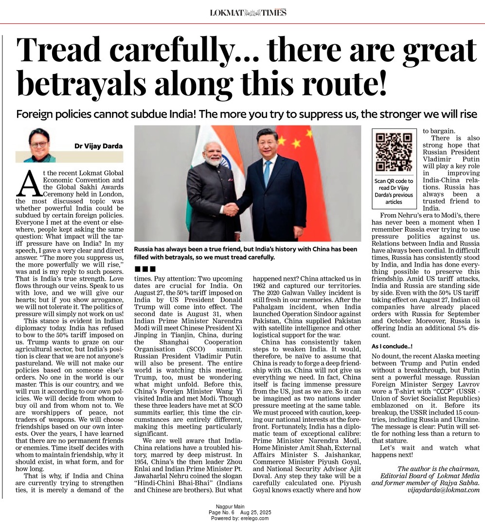At the recent Lokmat Global Economic Convention and the Global Sakhi Awards Ceremony held in London, the most discussed topic was whether powerful India could be subdued by certain foreign policies. Everyone I met at the event or elsewhere, people kept asking the same question: What impact will the tariff pressure have on India? In my speech, I gave a very clear and direct answer. “The more you suppress us, the more powerfully we will rise,” was and is my reply to such posers. That is India’s true strength. Love flows through our veins. Speak to us with love, and we will give our hearts; but if you show arrogance, we will not tolerate it. The politics of pressure will simply not work on us!