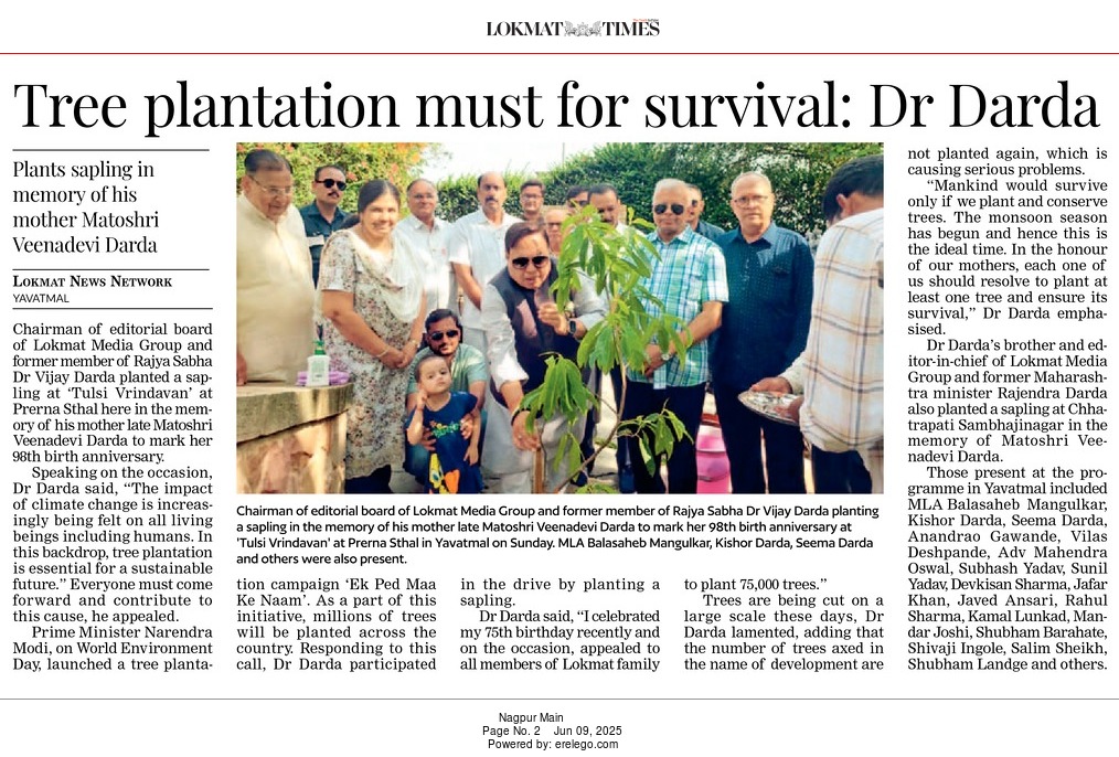 Dr Darda’s brother and editor-in-chief of Lokmat Media Group and former Maharashtra minister Rajendra Darda also planted a sapling at Chhatrapati Sambhajinagar in the memory of Matoshri Veenadevi Darda.