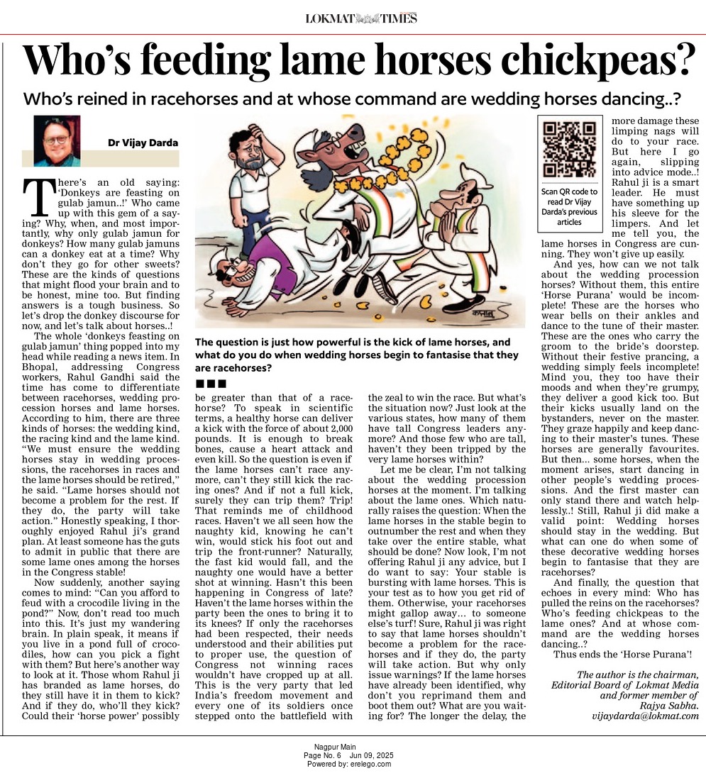 Let me be clear, I’m not talking about the wedding procession horses at the moment. I’m talking about the lame ones. Which naturally raises the question: When the lame horses in the stable begin to outnumber the rest and when they take over the entire stable, what should be done? Now look, I’m not offering Rahul ji any advice, but I do want to say: Your stable is bursting with lame horses. This is your test as to how you get rid of them. Otherwise, your racehorses might gallop away… to someone else’s turf! Sure, Rahul ji was right to say that lame horses shouldn’t become a problem for the racehorses and if they do, the party will take action. But why only issue warnings? If the lame horses have already been identified, why don’t you reprimand them and boot them out? What are you waiting for? The longer the delay, the more damage these limping nags will do to your race. But here I go again, slipping into advice mode..! Rahul ji is a smart leader. He must have something up his sleeve for the limpers. And let me tell you, the lame horses in Congress are cunning. They won’t give up easily.